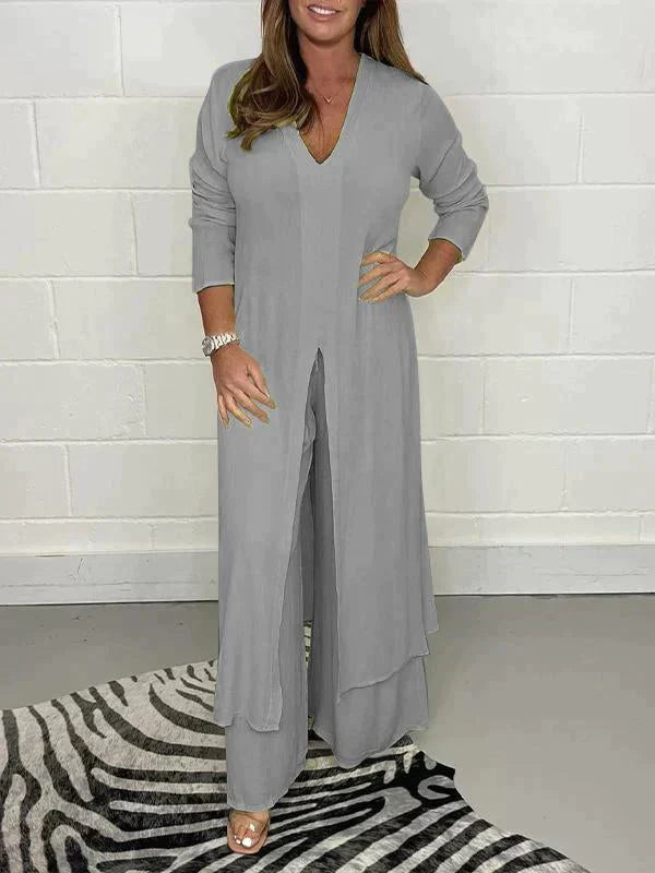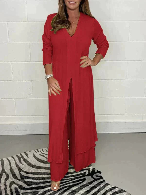 Elegancia sin esfuerzo: descubre la comodidad y la elegancia del conjunto de dos piezas con cuello en V y abertura Melis!